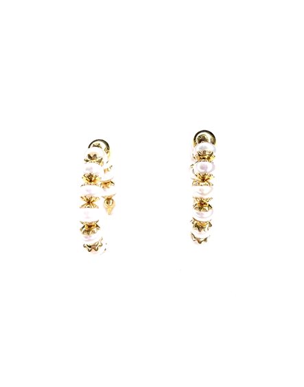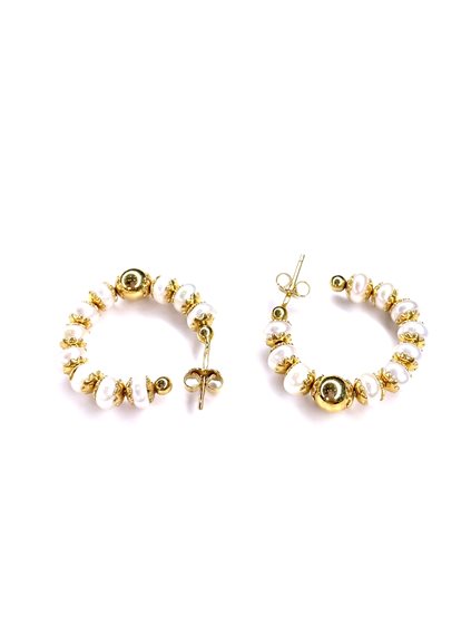 Orecchini a cerchio Stocco Gioielli con montatura in oro giallo 18 k e perle d'acqua dolce ,gr 8.95 ,diametro cm 2.5 .