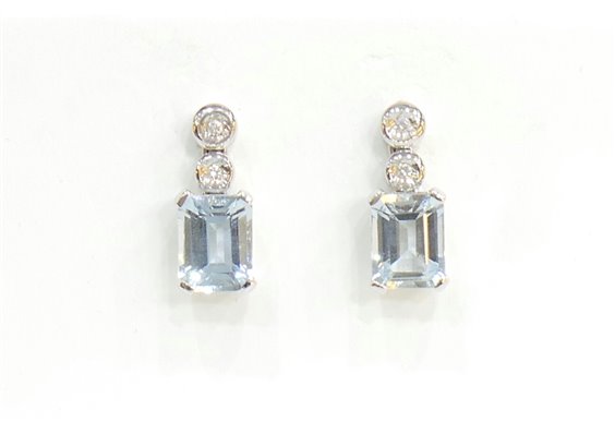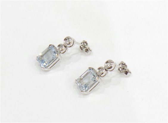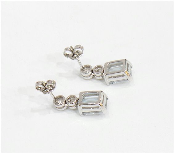 Orecchini oro bianco 18 Kt. con 4 diamanti taglio brillante di Kt. 0,10 con 2 acquemarine taglio smeraldo di KT. 3 peso gr. 5,5 attacco paletto lunghezza cm. 1,7