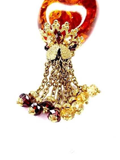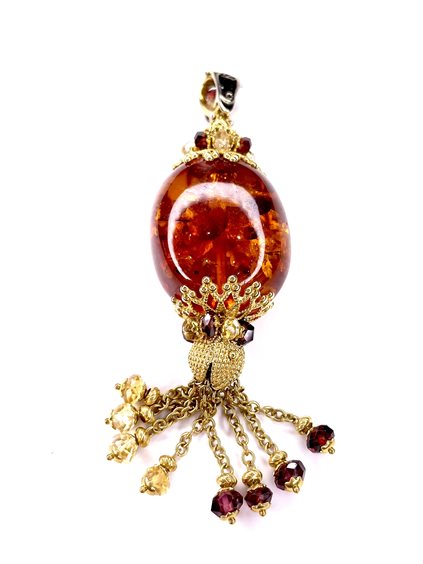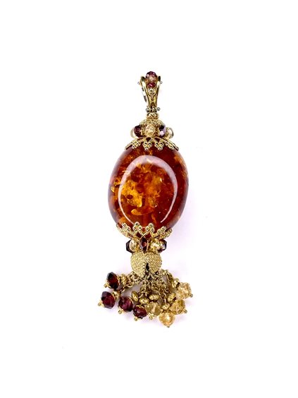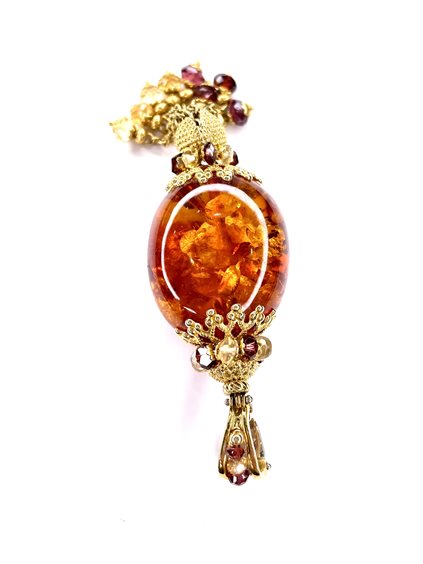 Pendente in ambra con montatura in oro giallo 18 kt e pietre dure naturali. lunghezza totale cm 8,5 gr 21,2. Sunday.