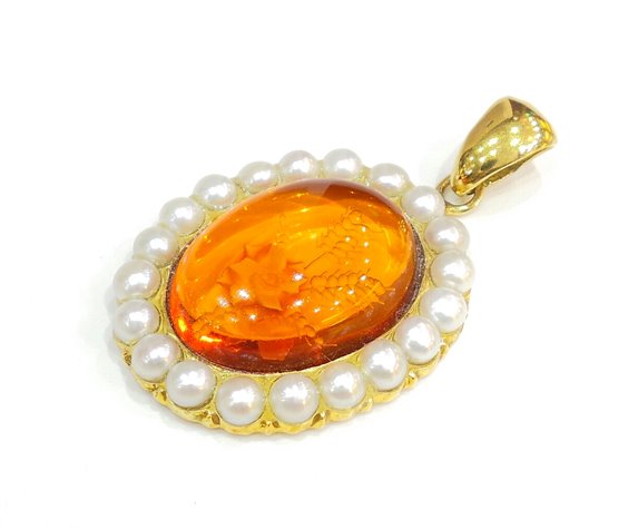 Pendente ambra incisa a motivo floreale con contorno perline di acqua dolce montatura oro giallo 18 kt. lunghezza compresa contromaglia cm. 3.5 peso gr. 8.35