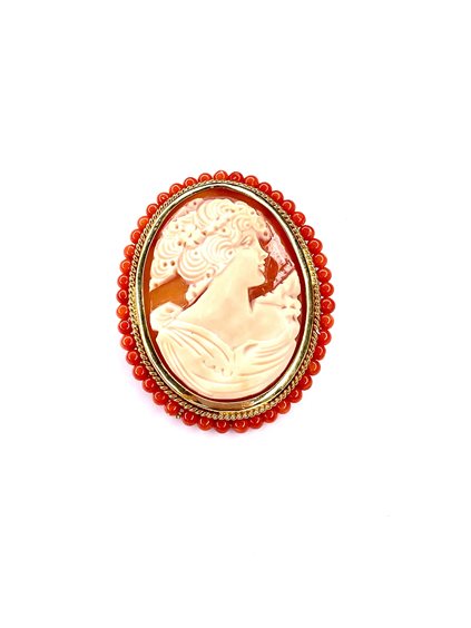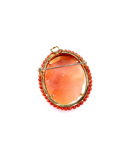 Cameo lavorato artigianalmente in stile antico con montatura in oro giallo 750/1000 gr 12,4 , contornato da piccole sfere di coralli . Puo' essere usato sia cme spilla che come pendente . Certificato d'autenticita' Oreficeria Stocco .