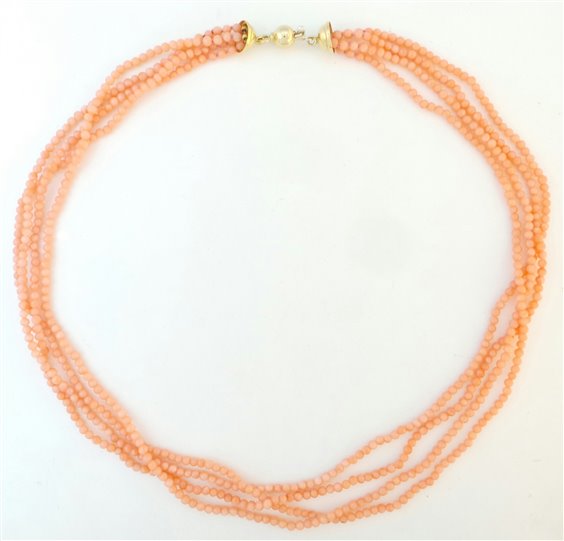 Collana in corallo rosa a 4 fili gr 17.4 con chiusura in oro giallo