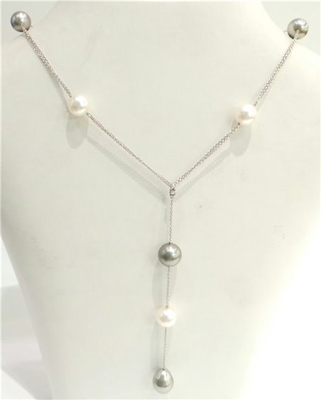 Collier in oro bianco 18kt, gr. 4,10 con catena rolò, lunghezza totale cm 41, impreziosito da perle naturali di acqua salata bianche e grigie, dimensioni mm 9, con pendente centrale cm 10, con perla finale a goccia grigia e piccolo ovale in oro bianco con brillantini. Chiusura a moschettone. Marca Yukiko