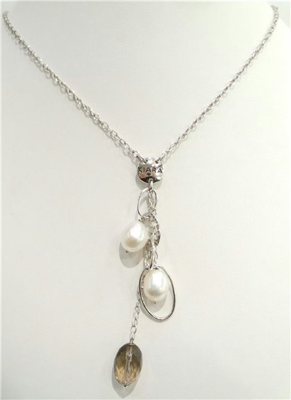 Collana in argento 925 misura lunghezza cm 49 e grappolo di pendenti in perle naturali di fiume e quarzo fume' sfaccettato. Chiusura con moschettone e pendente finale "da schiena". Marca Kiara.