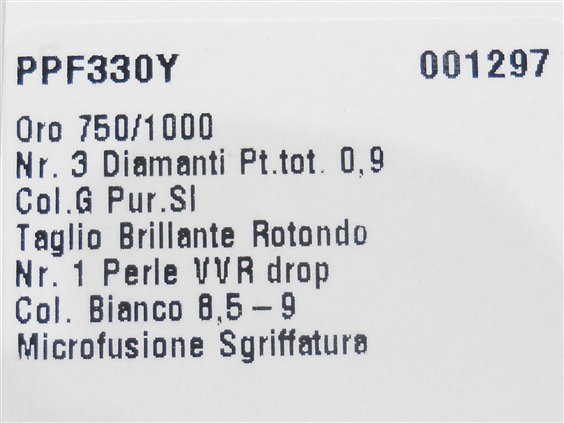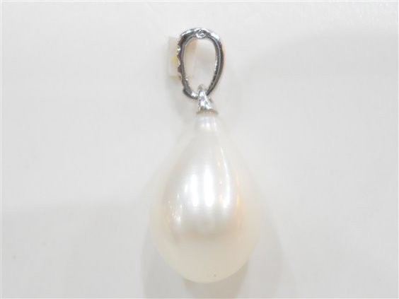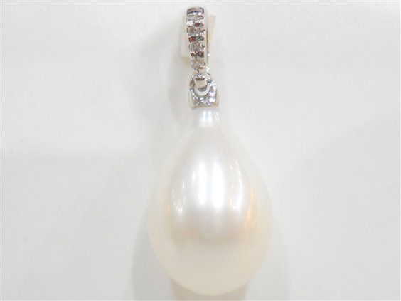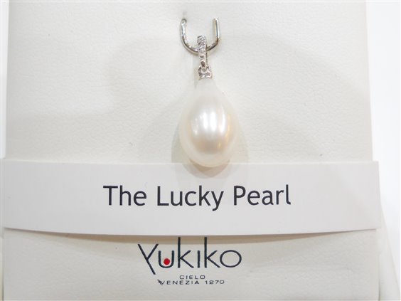 Pendente yukiko perla acqua dolce drop colore bianco diametro mm. 8.5-9 con tre diamanti per totali pt. 9 contromaglia in oro bianco 18 kt.